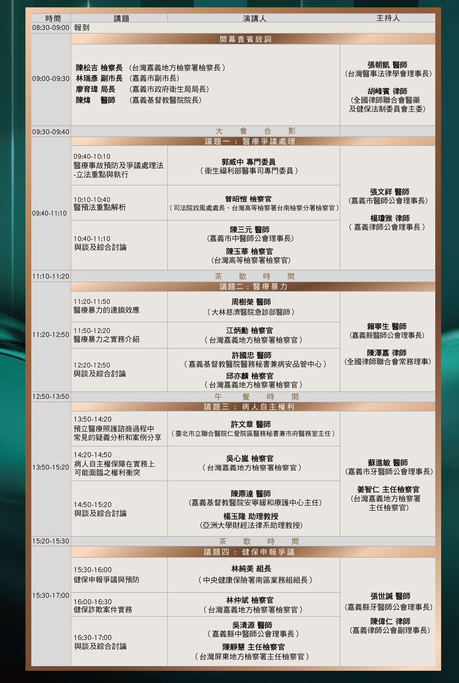 ◆指導單位:台灣嘉義地方檢察署、全國律師聯合會、中華民國醫師公會全國聯合會、中華民國中醫師公會全國聯合會、中華民國牙醫師公會全國聯合會、中華民國護理師護士公會全國聯合會
